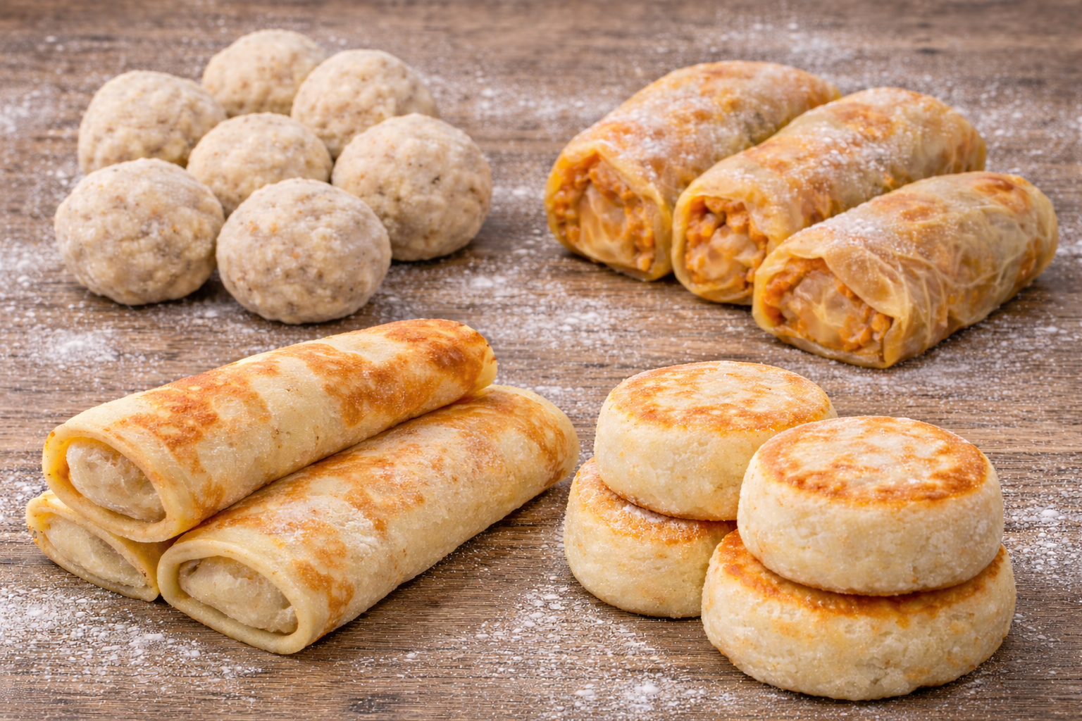 Склад: Голубці м’ясні, Млинці ситні з куркою, Млинці ситні з яловичиною, Млинці солодкі з яблуком та гарбузом, Млинці солодкі з яблуком, чорносливом та горіхами, Фрикадельки курячі, запечені, Сирники смажені солодкі, Сирники смажені солоні,